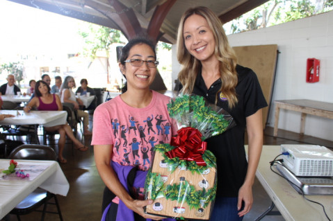 PCCA 1st Vice-President Lana Murakami is pictured with a happy Bingo prize pack winner.