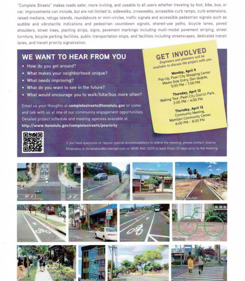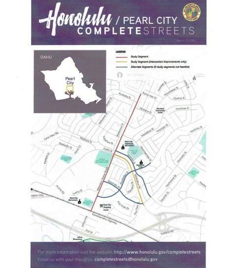 Comments are also welcomed via email at completestreets@honolulu.gov. Further project details and schedule are available online at http://www.honolulu.gov/completestreets/pearlcity.