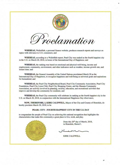 Mahalo to the City and County of Honolulu for presenting the Pearl City Shopping Center along with other community groups, with a proclamation on Tuesday, March 27, 2018, that honored the Pearl City community for being ranked the "4th Happiest City in America” by WalletHub.com from Washington, D.C.