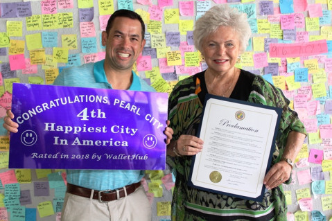 Mahalo to the City and County of Honolulu for presenting the Pearl City Shopping Center along with other community groups, with a proclamation on Tuesday, March 27, 2018, that honored the Pearl City community for being ranked the "4th Happiest City in America” by WalletHub.com from Washington, D.C.