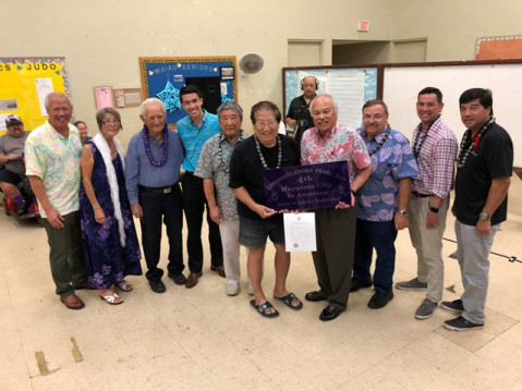 Pictured from L-R; State Representative Gregg Takayama , Pearl City Neighborhood Board Member Elaine Funakoshi, Pearl City community leader Kenji "Doc" Uejo, Councilman Brandon Elefante, Pearl City Foundation Board Member Jits Fujimura, Mayor Representative Manuel Valbuena, Pearl City Neighborhood Board Chairman Larry Veray, Pearl City Shopping Center Merchants Association President Shawn Sablan, and Pearl City Community Association President Barry Villamil.