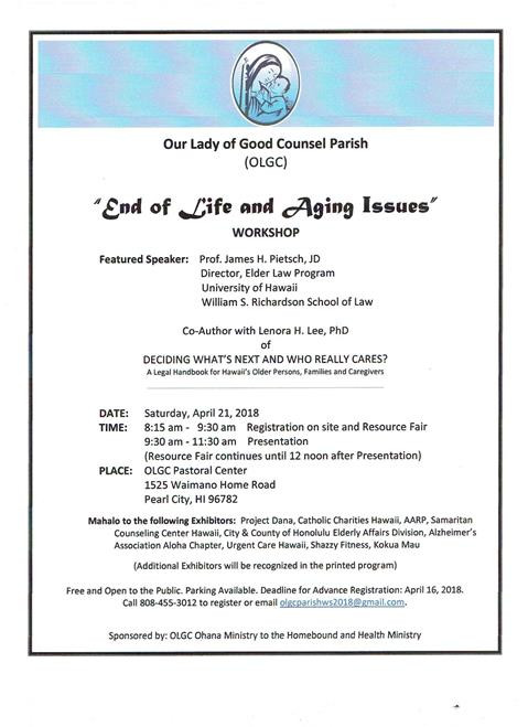 Our Lady of Good Counsel Parish will host the "End of Life and Aging Issues" Workshop featuring special guest speaker Professor James Pietsch, a highly respected authority on elder law and veterans issues from the University of Hawaii's William Richardson School of Law on Saturday, April 21, 2018. Please see flier below for more information: