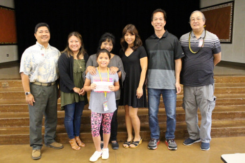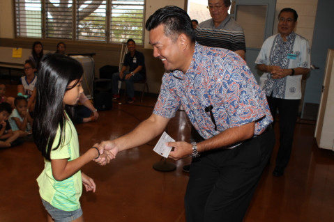 Pearlridge Rotarian David Matsushita presents Pearlridge Elementary third