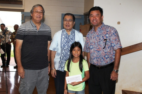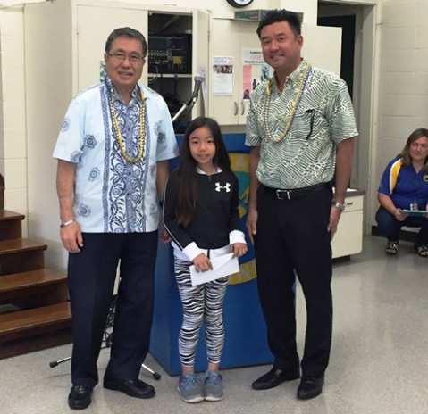School is pictured with Pearlridge Rotarians Rick Lau and David Matsushita.