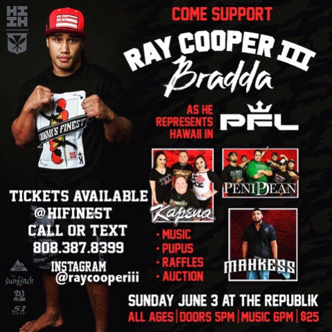 Come and Support Hawaii’s Local Boy Ray “Bradda" Cooper III at his Benefit Bash on June 3rd at THE REPUBLIK sponsored by HIFINEST! All ages welcome! Come and celebrate with us as Bradda will be the ONLY fighter in PFL to represent Hawaii!