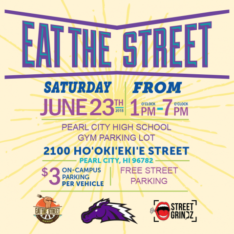 Pearl City High School will host their annual Eat The Street Food Truck Event Fundraiser on Saturday, June 23 from 1pm-7pm in the Gym parking lot. Funds raised go towards support of school organizations and programs. Please see poster below for more information.