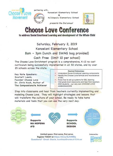 I have some exciting news about our first ever statewide conference we are hosting this school year. In addition to presenting at the upcoming Schools of the Future Conference, we will showcase our Choose Love Movement featuring Scarlett Lewis, the founder of the movement as well as Dr. Chris Kluk, author of The Compassionate Achiever. Teachers and staff from both Kanoelani as well as Ka’elepulu will be sharing hands on strategies and lessons that can be used immediately.
