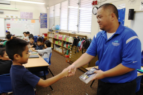 Momilani Elementary Assistant Principal Mr. Garrett Arakawa shakes the