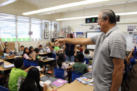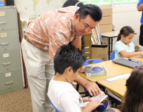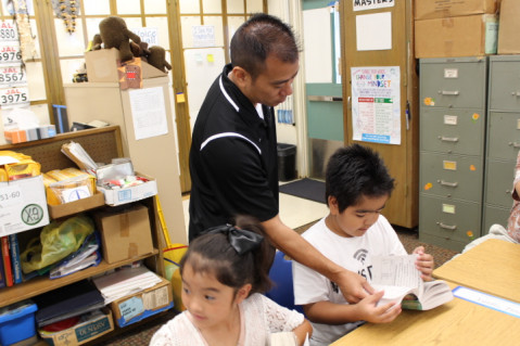 Momilani third grade teacher Mr. Masaru Uchino helps a student look up a word and