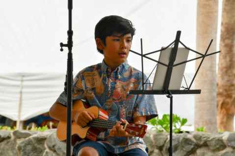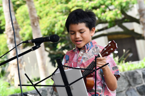 My mom surprised my brother and I today at the Children's Youth Day at the State Capitol.  She had Aloha Hula perform with two new children.  What was special about it. . these two are brothers, Slayter and Stryker.  They added a special touch to the performance.  They both had their moments playing ukulele and singing.  Slayter (the younger brother) wowed the crowd with his solo ukulele and vocal and performed and oldie but goodie, Fly Me To The Moon.  Then he sang a Hawaiian Studies song my mom taught him when he was younger while Caitlyn did the hula for the song Baby's Lu'au.  And he played the Finale song, Count On Me and sang with the entire group.  Stryker played Hawaii's own, Israel Kamakawiwa'ole's popular song, Somewhere Over The Rainbow while the Senior Hula Girls sang and he played Heart Strings while Arahmae sang.