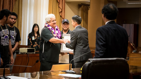 Honolulu City Councilman Brandon Elefante is pictured presenting Pearl City Chargers Junior Varsity Football Head Coach Robin Puahala with a Recognition Certificate from the City and County of Honolulu honoring the Chargers for capturing the 2018 Oahu Interscholastic Association Junior Varsity Division 2 Football Championship.
