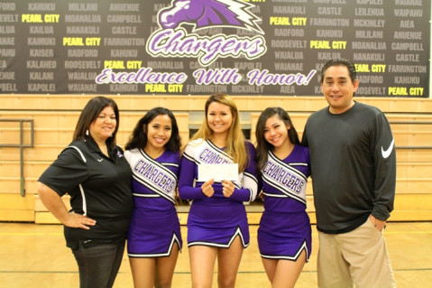 PCHS Athletic Director, Reid Shigemasa along with PCHS Cheerleading Program Head Coach Raenette Yuen, and three senior cheer team members who will be competing next week in Anaheim, Lauren Medina, Alisha Gleason and Charleah Kobuke accepted the donation check on Thursday in the school gymnasium.