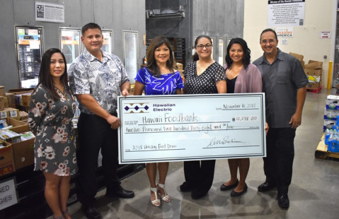 Caption: In 2018, the Hawaiian Electric Companies contributed more than $1 million to support hundreds of non-profit, charitable and social welfare organizations across its service territories and more than 4,500 employees and their families and friends also volunteered 13,395 hours of community service. A one-month long employee led food & fund drive by Hawaiian Electric employees resulted in 3,353 pounds of food and more than $12,000 raised for Hawaii Food Bank (HFB) during the holidays. Standing left to right: Beverly Santos (HFB Director of Food Drive & Events), Keola Siafuafu (Hawaiian Electric VP Enterprise Operations), Darcy Endo-Omoto (Hawaiian Electric VP Government & Community Affairs), Laura Kay Rand (HFB Vice President & Chief Impact Officer), Marielle Terbio (HFB Director of Community Engagement & Advocacy) and Ron Mizutani (HFB President & CEO). Photo by Travis Nishida, Hawaiian Electric.