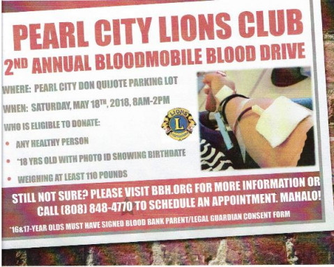 Please support the upcoming Pearl City Lions Club Blood Drive on Saturday, May 18, 2019 at the Pearl City Shopping Center.