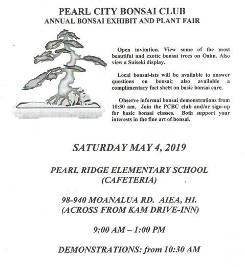 Check out the Pearl City Bonsai Club Annual Bonsai Exhibit and Plant Fair, Saturday, May 4, 2019 at the Pearl Ridge Elementary School cafeteria.