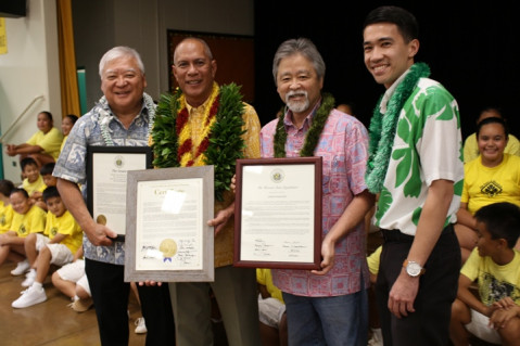 The evening began with a delicious Spaghetti dinner served inside the school cafeteria, followed by recognition certificates presented to Mr. Paragoso by Hawaii State Senator Clarence Nishihara, Hawaii State Representative Roy Takumi, and Honolulu City Councilman Brandon Elefante.