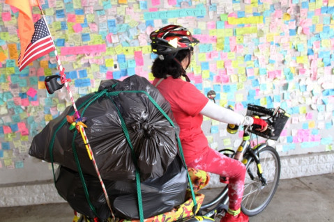 I met a wonderful soul today at the WALL – “With Aloha, Love Lives” that truly brightened my day with kindness and hope. Raquel rode by the WALL early this morning with a payload of two bags of cans that she was about to cash in at the Reynolds recycling center located in the Pearl City Shopping Center parking lot. After her trip to the recycling center, Raquel stopped back at the WALL and we chatted for a while. She told that that every morning she makes her way around Pearl City picking up bags of cans that her friends leave for her. She explained that every penny earned from recycling goes towards supporting our schools.