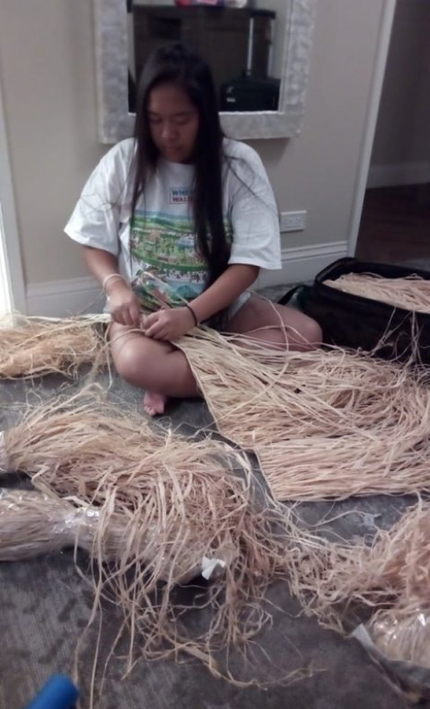 Our mom tried her best to help Kamalani finish the grass skirts.  She was  stressing and decided to make a Facebook post pleading for help.  And to our surprise, our mom's friend, Makua Janet, her daughter, Caitlyn, and friend, Cissy, came to the rescue and met up with us in Waikiki 4 hours before performance time and helped  finish all the grass skirts. .What a blessing .. .