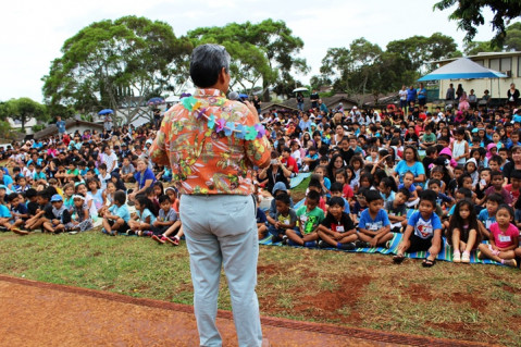Duane Kurisu speaks to the Kanoelani Elementary student body and ohana during the