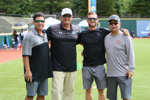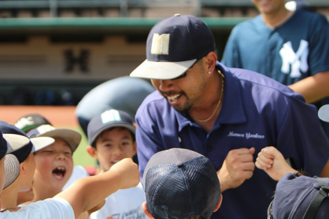 Mahalo to Rainbow Warrior Head Baseball Coach Mike Trapasso (2nd from left) and his coaching staff and ball players, along with Baseball in Paradise organizer Wes Yonamine (far right) for their partnership in turni that turns Les Murakami baseball stadium turf into the “Field of Dreams” for dozens of youth baseball players each year at the Baseball in Paradise Classic.