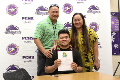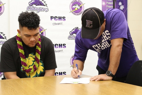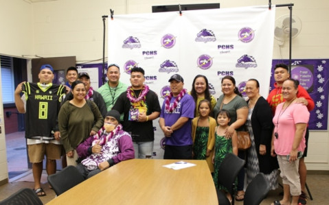 On February 5, 2020, Pearl City High School senior Brady Fa’auliuli proudly put his signature on the dotted line of a National Letter of Commitment to attend Missouri Southern State University via a football scholarship. Family, friends, football coaches, and Pearl City High School administrators and staff gathered inside the PCHS conference room in support of Brady who attributes his success to those in his life that have helped and guided him along the path to reaching his higher education goals and dream of playing collegiate football.