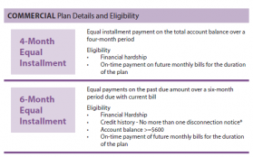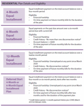 For payment arrangements, the total past due balance will be divided into equal monthly installments. Customers will continue to incur new energy charges each month that must be paid by the stated due date for the duration of the special payment arrangement plan.