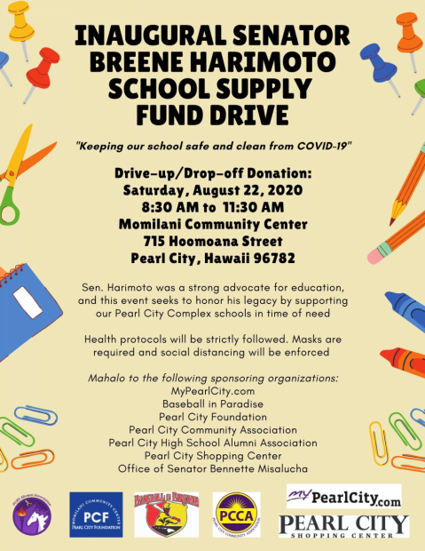 I would like to share the revised Inaugural Senator Breene Harimoto School Supply Fund Drive flyer files below that now includes a link for those who may be interested in making an online monetary donation in support of our school supply fund drive.