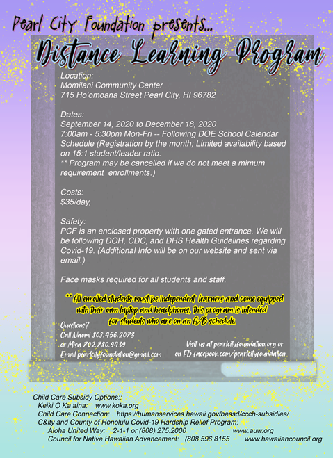 The Pearl City Foundation at the Momilani Community Center is launching a new program to help provide child care for distance learning.