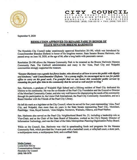 Mahalo to Councilman Brandon Elefante and his staff for their efforts to introduce resolution 20-190, and also to the full city council who unanimously voted in favor to rename Manan Community Park in honor our beloved community leader and friend, Breene Harimoto.