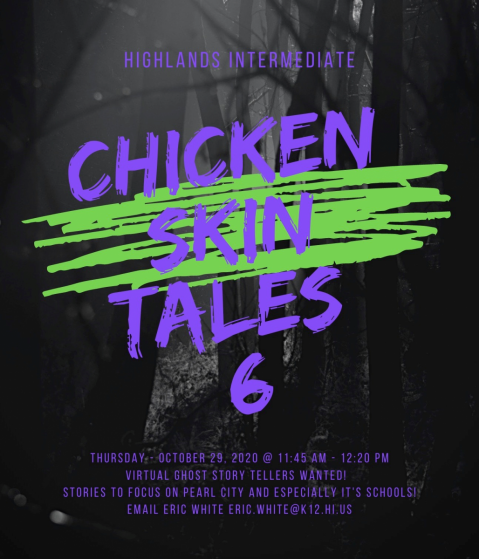 The event would be called Highlands Intermediate "Chicken Skin Tales 6" and will be running spooky stories sessions for lunch the whole week of Halloween, MON 10/26 – FRI 10/30. Lunch is 11:47 am – 12:22 pm. There may be after school spooky story sessions too that will start at 2:30 pm.
