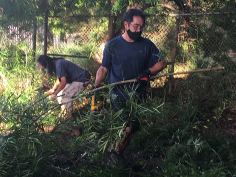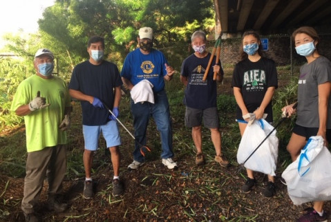 Thank you to the timely blessings from the Heaven’s for a break in the rain this morning so that volunteers from the Mana Loa-Nimitz Lions Club and their supporters could attack the overgrown landscaping under the freeway overpass on Kaahele Street in Aiea near the Dave’s Ice Cream parking lot. Volunteers cut down bushes, trimmed overgrown grass, and picked up rubbish in the area, as well as along the sidewalk.