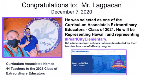 Congratulations to Pearl City Elementary School 3rd Grade Teacher Mr. Jason Lagpacan who was named to the Curriculum Associates Extraordinary Educators Class of 2021.