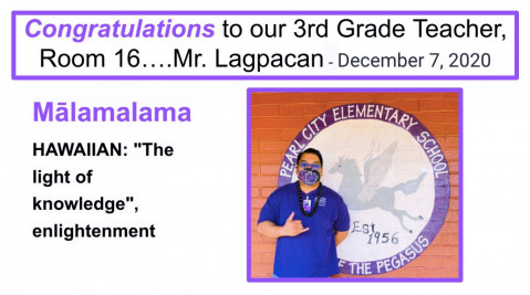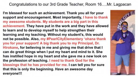 Mahalo to Mr. Lagcapan and Kumu Billy Remular for providing the content and photos and for the wonderful opportunity to share and post the great news. Once again, the national spotlight shines on another Pearl City District Complex teacher for their extraordinary dedication to their students and schools.