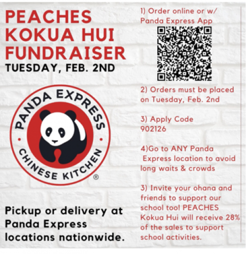 On Feb 2 Tuesday, Pearl City Highlands Elementary School PTA is having a fundraiser at Panda Express. People can order nationwide as long as they enter our code 902126 when ordering online or through the Panda Express app. Panda Express will provide Pearl City Highlands Elementary School PTA 28% of the total sales that are ordered on Feb 2. Funds raised will support school activities.