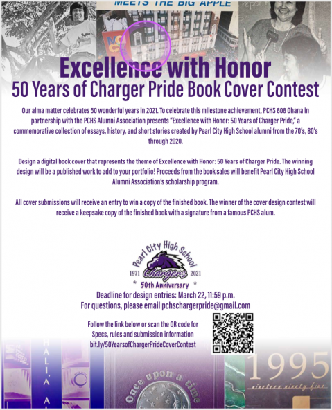 In commemoration of Pearl City High School’s golden anniversary in 2021, PCHS 808 Ohana in partnership with PCHS Alumni Association invites the community to participate in the Excellence with Honor: 50 Years of Charger Pride Book Cover Design Contest.
