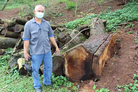 Mr. Alambatin is pictured next to a tree trunk that his crew has begun to cut through that will be crafted into a beautiful table top.