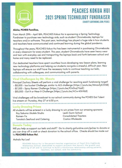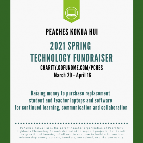 We are having a huge "Spring Technology Fundraiser" where we hope to raise $10,000 to help purchase replacement student and teacher laptops and software for continued learning, communication and collaboration. PEACHES Kokua Hui setup a GoFundMe page in hopes that the community can help support our keikis.
