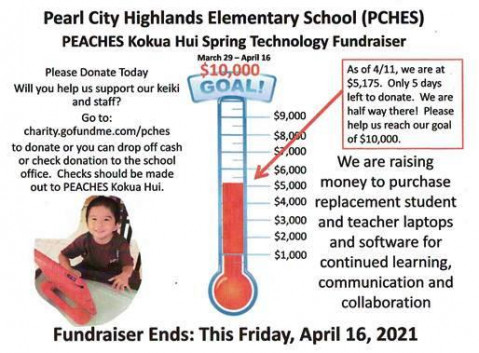 We are in the home stretch of our Spring Technology Fundraiser. Only 5 days left and we are half way to reaching our goal of $10,000.” Crystal Ikeda, PCHES PTA