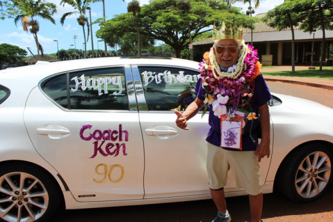 Congratulations to iconic Pearl City Coach Ken Suenaga who celebrated his 90th Birthday with a drive by celebration Saturday afternoon at the VMAC – Veterans Memorial Aquatics Center in Waipio.