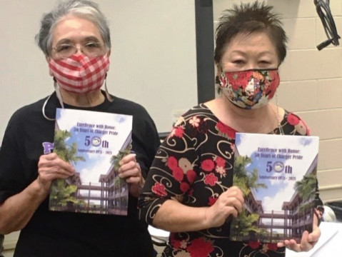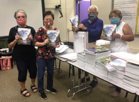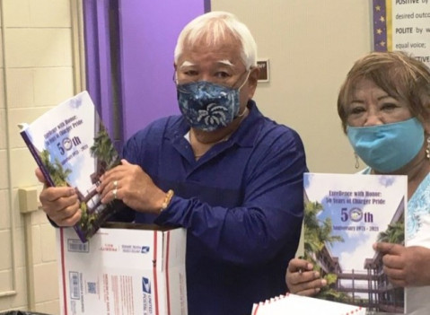 The anniversary books arrived hot off the press Thursday afternoon at Pearl City High School. Retired PCHS teachers and anniversary book committee members; Joanne Ing, Arlene Aranita, and Sherry and Calvin Abe were hard at work in the school library filling and packing online book orders for mailing. They will also coordinate and lead a PCHS 50th Anniversary Book drive-thru pick-up distribution event at Pearl City High School on Saturday, September 11, 2021.