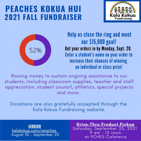 PCHES PTA (PEACHES Kokua Hui) informed me today that we raised about $7,800 of the $15,000, so we are half way there. Yay! The last day to order online is Sept 20 Mon, so we have 4 more days left to raise $7,200.