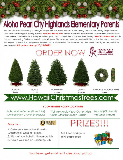 Do you need a Christmas Tree and/or Wreath?  Instead of buying from a big box store, please consider supporting our Christmas Fundraiser.  PCHES is partnering with Habilitat to offer a Christmas Fundraiser, where orders are being accepted online at www.HawaiiChristmasTrees.com from now to Oct 22, 2021.  There are 4 types of Christmas Trees to choose from and 1 Wreath/Doorcharms, 6 Convenient Pickup locations to choose from for Pickup on December 4.  Tickets will be mailed on November 8.  Please choose School Name = "Pearl City Highlands" when ordering on the website.