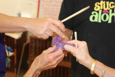 Kay passed out a piece of mochi for each of us along with a wooden chopstick which we used to pound our mochi. We stuck our mochi together, made a toast, and downed each piece as part of our New Year, Stuck on Aloha stay together celebration.