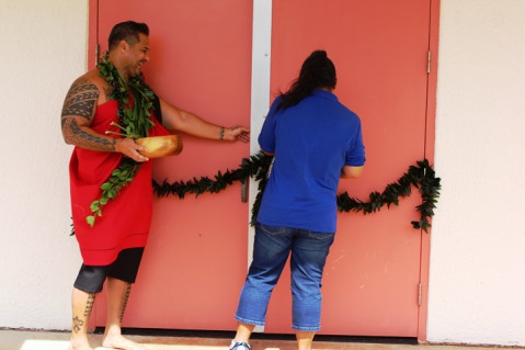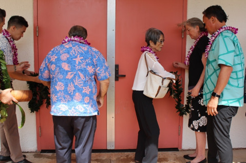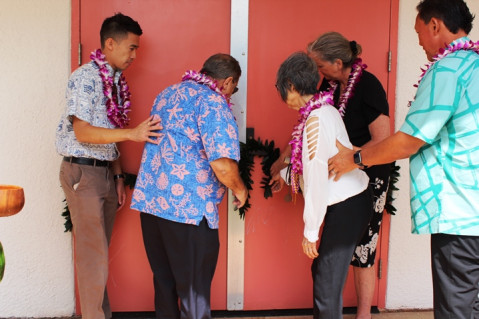 Elayne Funakoshi assisted in the untying of the Maile lei and opening of the facility front doors.