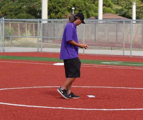 Kahu Kekoa blesses home plate at the Lady Chargers softball field.