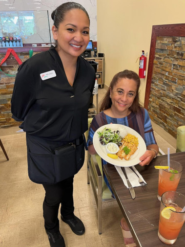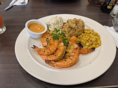 After a warm welcome by management and staff, Mary and I were treated to dinner, followed by a gift box of goodies from the bakery to take home. Everything was so delicious, and the portions were filling. Mary dined on the mahimahi plate, and I had the jumbo shrimp plate, and we both enjoyed Mango iced tea.